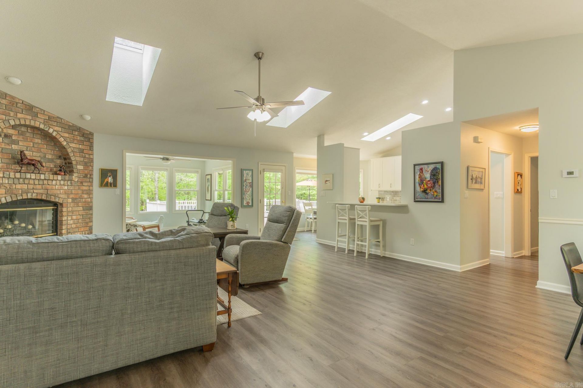 Beautifully remodeled home on private lot. Features include Luxury vinyl flooring in living areas. Tile in Sunroom and bathrooms. Freshly painted throughout interior and popcorn ceilings removed. All New light fixtures and ceiling fans. Vaulted ceiling in Living room and kitchen. Skylights for natural light. Kitchen has been re-done with Quartz counters, Kohler farm sink, all New Klearvue kitchen cabinets with soft close and roll out shelves. New cooktop, wall oven and microwave. Primary bedroom has new carpet and a tray ceiling. Primary bath has jetted tub and walk-in shower. 2nd bedroom also has a vaulted ceiling. Out back there is a spacious Deck for outdoor entertaining. Also, with a fenced in area for the pets in the back yard. There is also a spacious Workshop beneath the home for all of your hobby's. AGENTS SEE AGENT REMARKS!