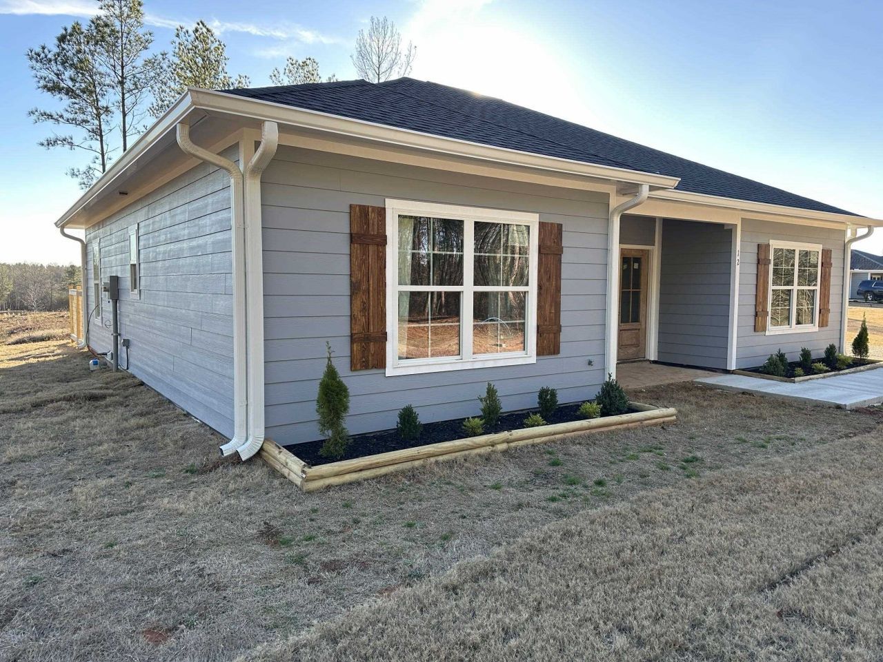 This new construction 3bd/2ba home is 1300 sq ft. Spacious kitchen with stainless steel appliances and pantry. The master has a large 42x60 soaker tub, double vanity and separate shower. The guest rooms are nice sizes. Home has an electric on demand water heater. Landscaping has been provided on the front and has a fenced in area on the back. Home will be ready in February 2026. Home sites on half an acre.