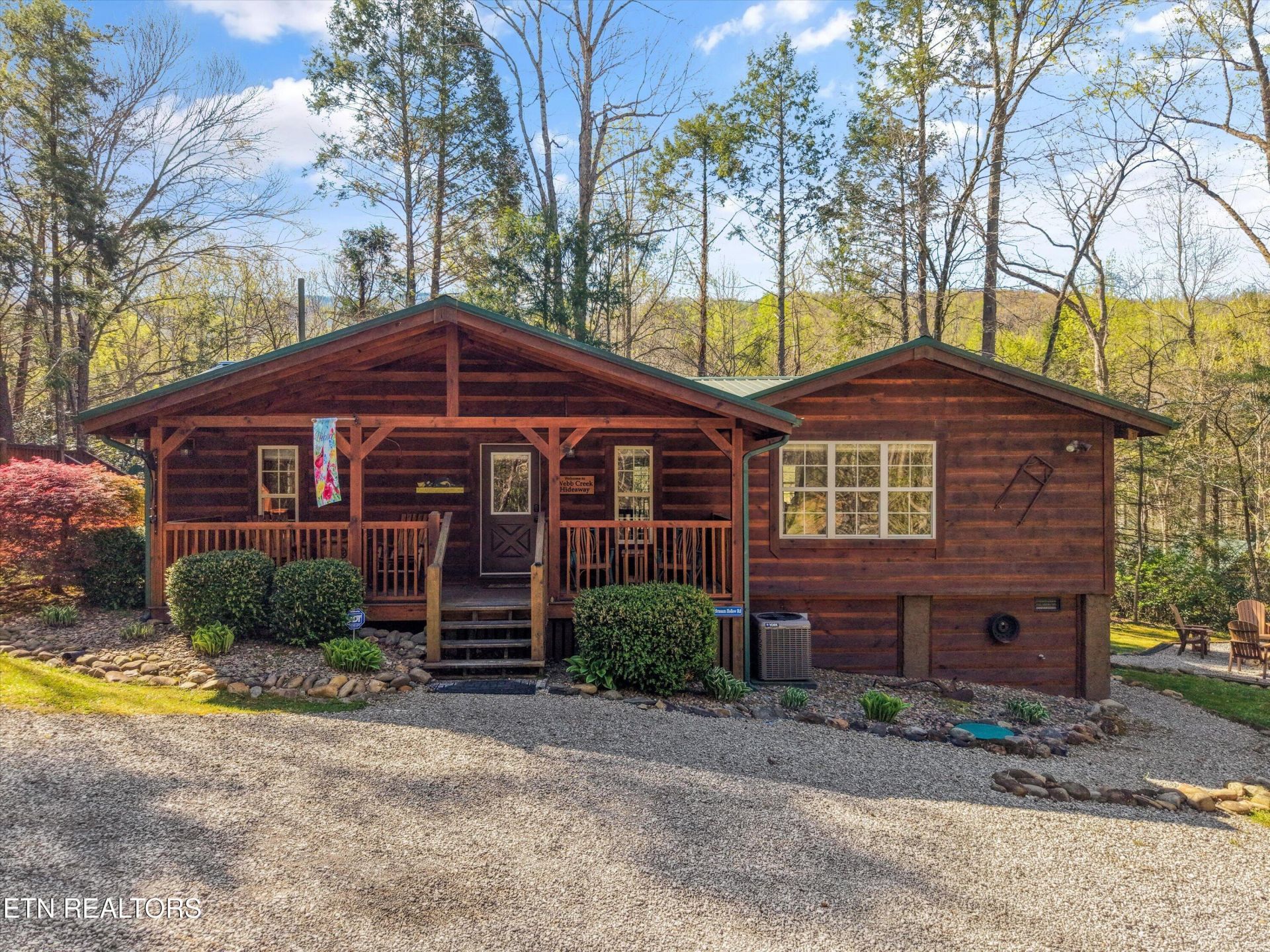 With average annual rental income of $51,500+ since 2017, this private 2BD/2BA updated log-style cabin in Cobbly Nob offers strong investment potential just minutes from downtown Gatlinburg, the Great Smoky Mountains National Park, and area attractions.Enjoy the peaceful setting with a babbling creek just off the covered deck (across the road) along scenic Webb Creek. Inside, the spacious great room features a masonry fireplace, large flat-screen TV, and pool table (Megatouch Aurora bar-top game negotiable) and opens to a well-designed kitchen and dining area. Both bedrooms are private primary-style suites with fireplaces and ensuite baths featuring custom tile walk-in showers.Quality wood finishes throughout, a relaxing hot tub on the covered deck, and easy access to county roads and nearby highways make this a perfect Smoky Mountain getaway or turnkey short-term rental opportunity.