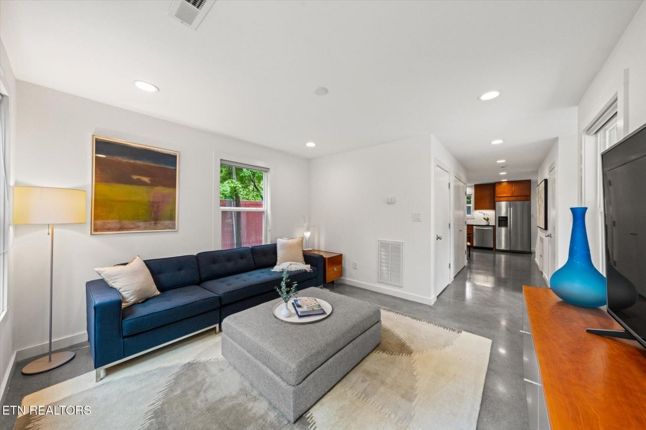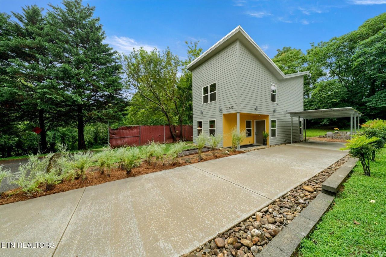 Don't miss The Butterfly Roof House characterized by its distinctive V-shaped profile, the butterfly roof is an icon of modern architecture. Located in Knoxville's historic district (but without the historic home maintenance) and 2.5 miles from Downtown and the University of Tennessee, this 2 bedroom and 2.5 bath home was newly built and specifically designed in 2015 to give the sense of space and roominess. Natural light, ventilation facilitated by the roof, and its high degree of insulation contribute to overall energy efficiency.Through the front door, you are welcomed with contemporary concrete floors that expand through the first floor living room, eat-in kitchen, powder room, laundry, and storage spaces. The kitchen is complete with granite countertops, appliances, walk-in pantry, and views of the stone patio and large backyard greenspace.Upstairs through the wide stairway, the second floor opens to an expansive landing, providing core separation and privacy from the two en-suite bedrooms. Each bedroom, intentionally located at the high end of the butterfly roof, features a private bathroom, own storage space, and a private balcony to enjoy your morning coffee while overlooking the greenway and creek.This home also includes custom window shades, custom metalwork, keyless entry, high-end interior door hardware, and solid-core doors throughout. The 6-camera security system can easily be monitored by a phone app. Situated on a cul-de-sac, this home has interior views of green landscapes, off-street covered parking, generous parking for guests, and is steps away from walkable sidewalks and life's conveniences.