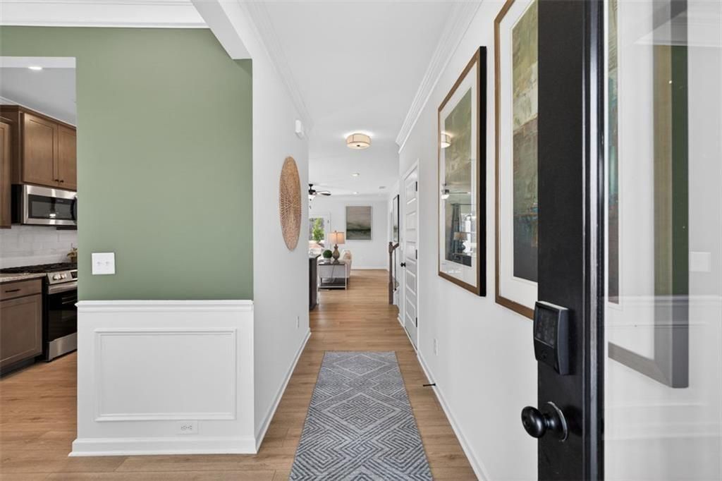 Move-In Ready July! The Caldwell, a beautifully designed home by Smith Douglas Homes, located in the desirable Oakmont community. This thoughtfully crafted floor plan is ideal for homeowners seeking the ease and comfort of main-level living without sacrificing space or flexibility. At the heart of the home, you'll find a spacious family room featuring a sleek linear fireplace, creating a warm and inviting atmosphere perfect for everyday living or entertaining guests. The family room flows effortlessly into the well-appointed kitchen, offering an open-concept design that keeps everyone connected. Highlights include 42 upper upgraded cabinetry and gleaming granite countertops. Step outside to the covered rear porch, an ideal space for relaxing mornings or evening gatherings while enjoying the outdoors. The main-level Primary Suite provides a private retreat just steps from the central living areas, delivering both convenience and comfort. This home is perfectly suited for single-level living, with all essential spaces easily accessible on the first floor as well as vinyl plank flooring creating a seamless flow from room to room. Upstairs, the Caldwell offers exceptional versatility with two additional bedrooms, a full bathroom, and a spacious loft, ideal for a home office, media room, or guest retreat. Both floors feature Smith Douglas Homes' signature 9-foot ceilings, enhancing the open and airy feel throughout the home. This home blends smart design with modern living in a vibrant community setting. Photos are representative of the plan and not of the actual home being built. Seller incentives available with the use of a preferred lender?don't miss this opportunity to make Oakmont your home!