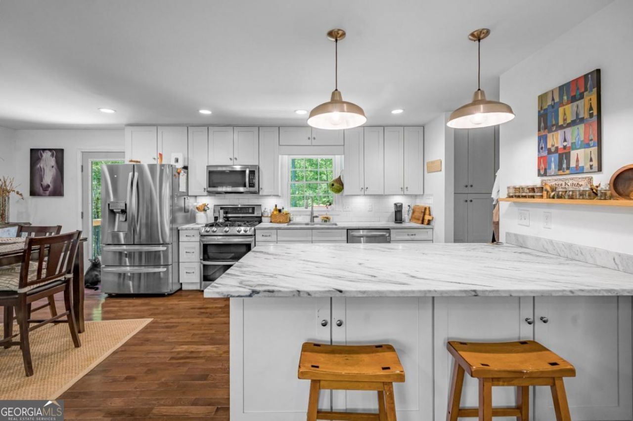 Tucked away on 4.5 picturesque acres in the heart of Cherokee County, this stunning four-sided brick ranch offers the kind of lifestyle buyers dream about-but rarely find. Just minutes from charming historic downtown Ball Ground, this property blends peaceful country living with easy access to local dining, shops, and community events that give the area its small-town charm. Inside, the home has been thoughtfully updated to reflect both comfort and style. A flowing, open-concept layout creates an inviting space for everyday living and entertaining, while the beautifully renovated kitchen features stainless steel appliances, modern finishes, and plenty of room to gather. With four generously sized bedrooms and two updated bathrooms, there's space for everyone to feel right at home. Step outside-and this is where the magic really happens. A brand-new, expansive custom deck overlooks the rolling acreage, offering the perfect place to unwind, host, or simply take in the peaceful surroundings. Whether it's morning coffee or sunset dinners, this space was designed to be enjoyed. For those seeking a true equestrian or hobby farm lifestyle, the property delivers in every way. The custom-built barn is both functional and beautifully crafted, complemented by a professionally designed Ramm cable arena, multiple stalls, tack room, office space, and electricity already in place. The fenced pastures are lush and ready-ideal for horses or even an income-producing boarding opportunity. A full basement provides additional flexibility for storage, expansion, or future customization-making this home as practical as it is beautiful. Beyond the property itself, Ball Ground is known for its welcoming community, historic downtown, local festivals, and access to outdoor recreation-from nearby trails to the foothills of the North Georgia mountains. It's a place where life slows down just enough to enjoy it. This is more than a home-it's a lifestyle opportunity with space, privacy, and purpose!