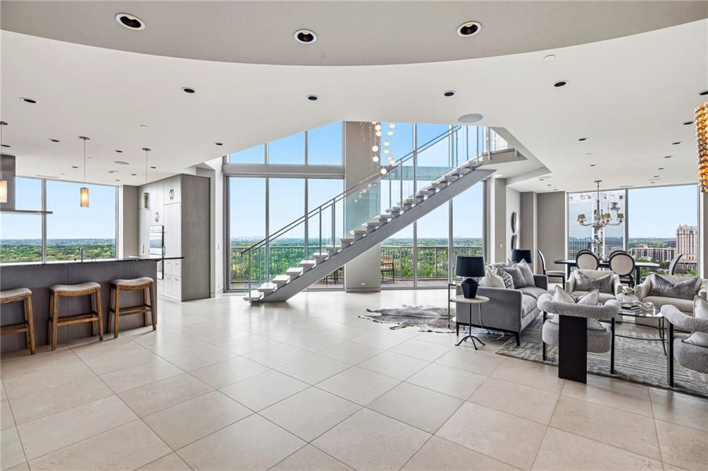 Perched atop the 26th and 27th floors of The Gallery, this one-of-a-kind penthouse delivers an unparalleled blend of sophistication, scale, and designer finishes following a $1M+ renovation. Framed by unobstructed city views and expansive outdoor living, the residence is defined by a dramatic open floorplan, floor-to-ceiling windows, and a striking floating staircase with limestone treads, glass panels, and stainless railings?all anchored by 24x24 limestone flooring and a breathtaking 10-foot Swarovski crystal chandelier. At the heart of the home, a showstopping Design Galleria kitchen rivals the finest European designs, featuring custom cabinetry with soft-close systems, dual pantries, and top-tier appliances including Wolf ovens and cooktop, Sub-Zero refrigeration with drawers, Bosch dishwashers, warming drawers, double wine fridges, ice makers, Viking trash compactors, a built-in espresso machine, and filtered hot water. Seamlessly integrated Crestron smart home technology elevates everyday living, controlling lighting, climate, shades, entertainment, and security with ease. Custom lighting throughout, all on dimmers, enhances the home's refined ambiance. The primary suite offers a true spa experience inspired by Miami's finest retreats, complete with a Kohler air tub, Toto toilet, THG French fixtures, mosaic tilework, floating double vanity with LED lighting, and a Thermasol programmable steam shower with rain head and bench. A boutique-style, room-sized walk-in closet and custom floor-to-ceiling cabinetry with integrated storage complete the suite. Upstairs, Porcelanosa hardwood floors extend through all bedrooms and laundry, while a beautifully appointed guest suite features a Carrara marble vanity, frameless shower, and designer finishes. The living room showcases a Porcelanosa white rock feature wall with a Dimplex fireplace, creating a stunning focal point for entertaining. Additional highlights include energy-efficient zoned HVAC with commercial-grade air handlers, whole-house water recirculation, a private storage unit, and three deeded parking spaces. Residents of The Gallery enjoy a full-service lifestyle with a strong HOA and exceptional amenities including a state-of-the-art fitness center, heated outdoor pool, tennis court, guest suites, business center, club room with catering kitchen, theater/screening room, outdoor fireplace and grilling areas, dry cleaning services, and curated social spaces. The building's unique art program features rotating installations from local artists, with quarterly gallery receptions and community events. This is a rare opportunity to own a truly irreplaceable penthouse?where elevated design, advanced technology, and resort-style amenities converge in the sky. Welcome home.