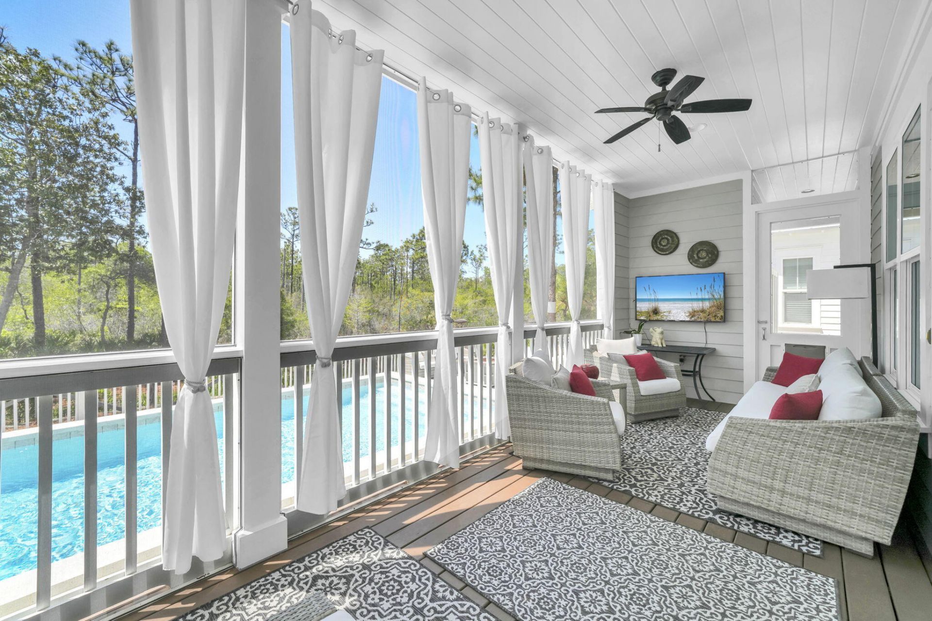 Your NatureWalk Nest Awaits! Experience refined coastal luxury & the pinnacle of coastal elegance in this impeccably curated, move-in-ready retreat, perfectly suited as a private sanctuary or premier investment property. Ideally positioned on a desired lot with easy access to pickleball and amenities within the highly sought-after community of NatureWalk Seagrove, this exceptional residence offers effortless access to the world-renowned beaches of 30A, including Seagrove, Seaside, WaterColor & Grayton Beach along with upscale dining, boutique shopping & vibrant entertainment. Step into your own private resort-style oasis, where a heated saltwater pool, expansive lounging areas, a cozy firepit, outdoor shower, & an inviting screened porch create unparalleled outdoor living experiences. Thoughtfully designed for health, relaxation & recreation the grounds also feature a climate-controlled lockout and a dedicated space for leisure activities. The tranquil backyard showcases serene water views and native landscaping, all bordered by the protected beauty of Point Washington State Forest, offering rare privacy and a true connection to nature. This home lives large & reflects a commitment to both sophistication & wellness, with no carpet & premium engineered wood & tile flooring throughout. The expanded & upgraded chef's kitchen is a statement of style & function, featuring stainless steel appliances, professional 33' refrigerator & freezer units, newly upgraded custom cabinetry, gas cooking, abundant & expansive storage, exquisite finishes, and a warm, inviting hearth. Professionally designed and appointed, the home offers impressive gathering spaces, bespoke finishes, & a grand dining area ideal for entertaining. Guests enjoy a private retreat with scenic views & private outdoor balconies. Additional features include a one-car garage with custom storage and a private driveway with an extraordinary capacity for up to five vehicles--an exceptional luxury in Seagrove! Meticulously maintained and beautifully appointed, this residence delivers a seamless blend of comfort, privacy, and elevated, healthy, coastal living. Private tours are available for this exceptional offering.