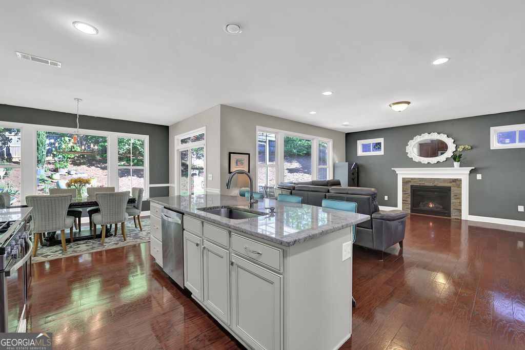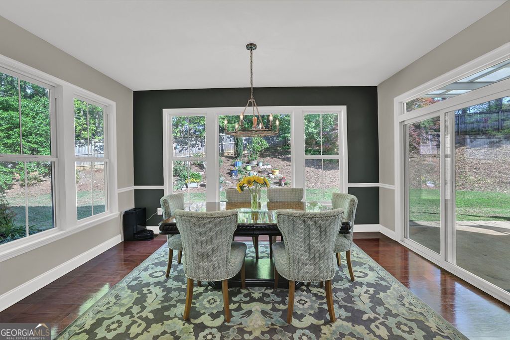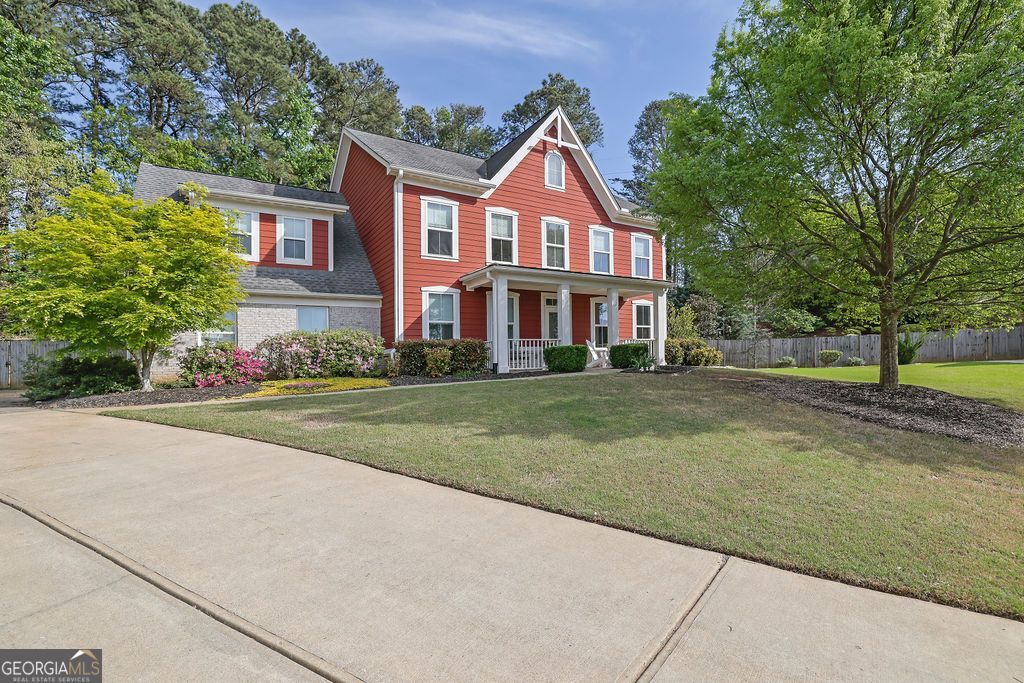 From the moment you arrive, this bold, head-turning home makes a statement all its own! The striking red exterior delivers curb appeal unlike anything else on the block, framed by a covered front porch and nestled on a large cul-de-sac lot for privacy and tranquility. Inside, natural light pours through large windows across the main level, where gleaming wood floors, a spacious family room with cozy fireplace, and a well-appointed kitchen with granite counters, tiled backsplash, gas range, center island, and walk-in pantry come together beautifully. A stunning French door flex room can be whatever you need it to be - home office, playroom, formal dining, creative studio, you name it. Tucked away from the kitchen and family area for added privacy, the main floor bedroom with full bath and walk-in closet is perfect for guests, in-laws, or anyone who loves a little separation from the main living space. Upstairs, the oversized primary suite is a true retreat, tucked behind its own private entry hall with dual doors, offering a serene sitting area, stunning views of the backyard garden below, and an absolute showstopper of a spa-like tiled walk-in shower with bench. Step outside to your private backyard oasis featuring a beautifully landscaped garden, covered patio, large shed, and full fencing. Just minutes to GA-400, shopping, dining, and downtown Cumming, and zoned for top-rated Whitlow Elementary (9/10 GreatSchools) in one of Georgia's highest-ranked school districts!