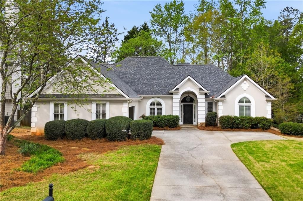 Welcome to this charming, beautifully maintained 1.5-story home featuring a sought-after primary suite on the main level. This 4-bedroom, 3.5-bath residence is located in a desirable swim/tennis community and zoned for top-rated schools. The main level offers a versatile den with a wall of windows and a double-sided fireplace overlooking a serene, wooded backyard?perfect as a formal dining space or cozy reading nook. The spacious family room showcases a cathedral ceiling, a striking chandelier, and a warm fireplace, creating an inviting gathering space. Hardwood flooring flows throughout the entire main level for a seamless and elegant look. The main-level primary suite features a tray ceiling, separate his-and-hers walk-in closets, and a beautifully renovated bath complete with double vanities, a frameless walk-in shower, and a standalone soaking tub. The kitchen is appointed with white cabinetry, stunning stone countertops, and a designer backsplash, and opens to a bright keeping/breakfast room?ideal for casual dining and everyday living. Convenience continues with a main-level laundry room with cabinetry. Secondary bedrooms on the main floor are spacious and share a Jack-and-Jill bathroom, offering flexibility for family, guests, or home office use. Upstairs, you'll find an oversized bedroom with a fully renovated private bath. Enjoy outdoor living on the elevated deck overlooking peaceful wooded views. Major update includes a new roof and gutter (2025) AND ALL bathrooms (2026). Located in the highly acclaimed Lambert High School district and just minutes from shopping, dining, parks, and the exciting new Medley development in Johns Creek.