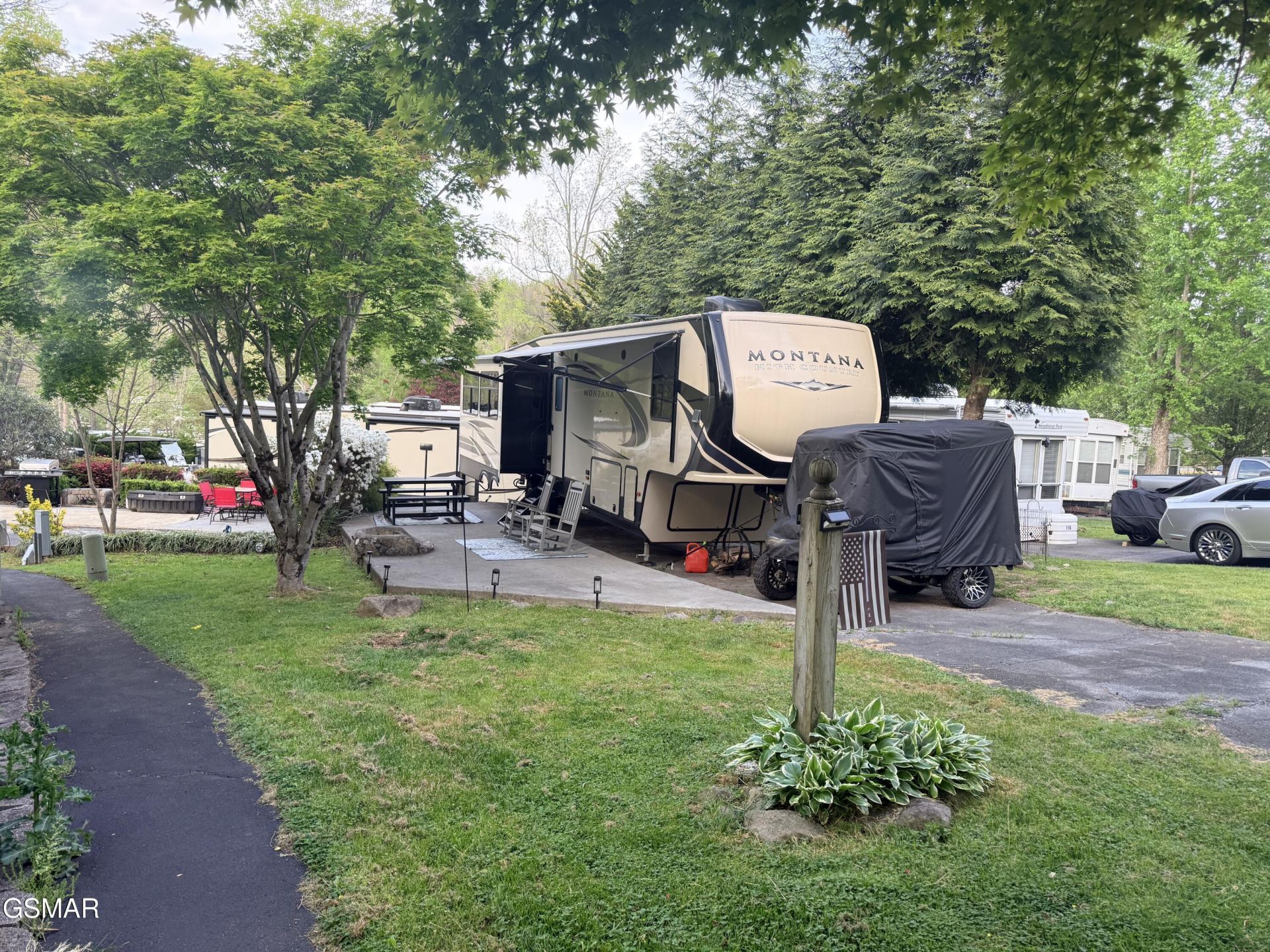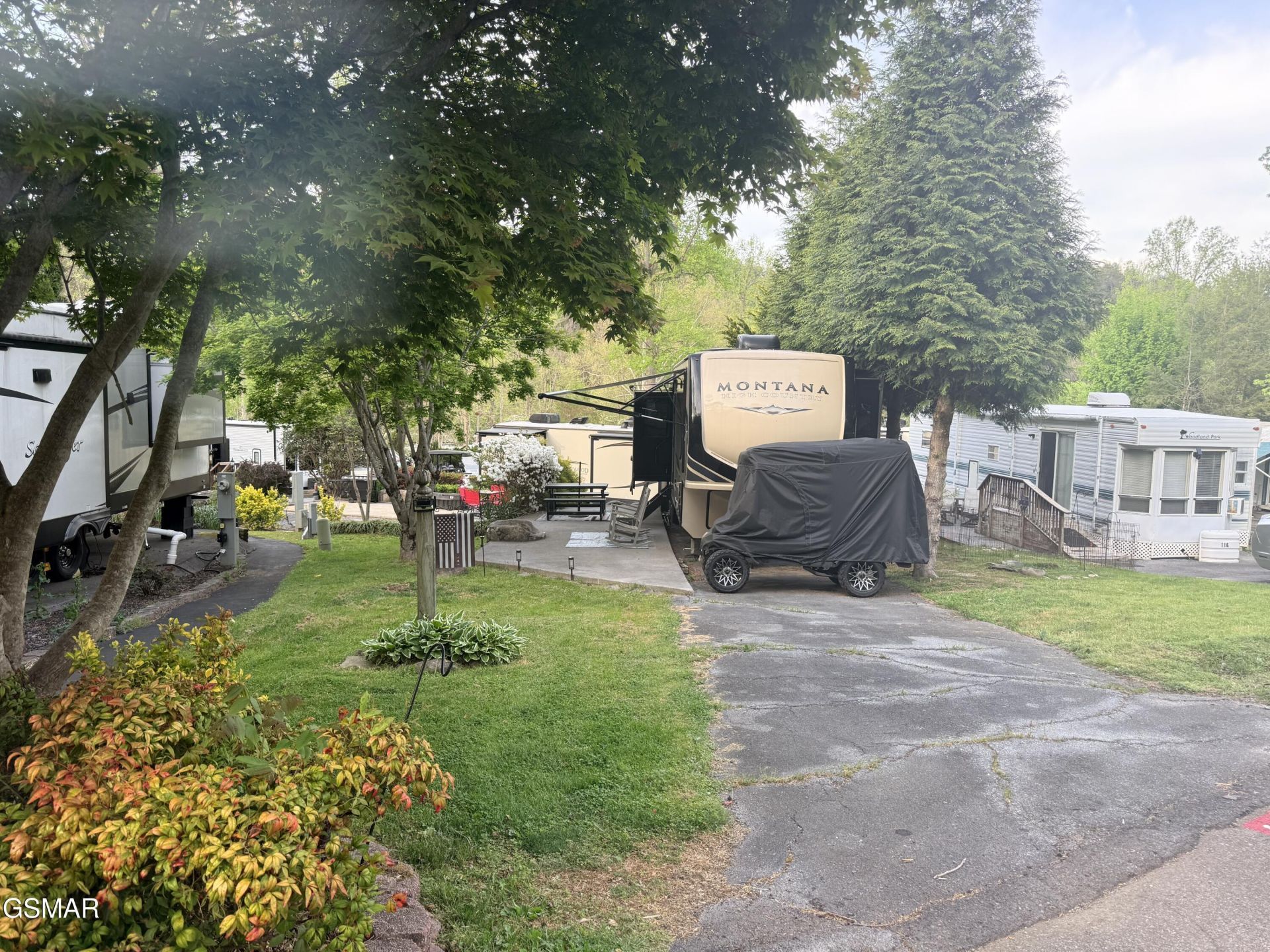 NOTE: Lot ONLY available for $85,000 or Lot with camper at $119,900!Beautifully landscaped lot with 2019 Montana High Country HM331RL 5th wheel camper located just a short walk to the main pool and the common amenities. The lot has a patio with fireplace and a nice green space perfect for gathering with family and friends. In addition, the lot is level, surrounded with trees and bushes, and has a long parking area. Beside the lot is a walking path to one of the resort's bathhouses for when additional facilities are needed. Included with the lot is a beautiful and very well kept one owner 2019 Montana High Country 5th wheel model HM331RL with a 4 season package. Outside, the camper has 3 slides with slide toppers, power awning, and lots of basement storage space. Inside it has a rear living room with electric fireplace, a large flatscreen tv, double recliner and a queen sleeper sofa. Kitchen has solid surface countertops, stainless steel appliances including residential refrigerator, stove/oven, and microwave, a nice pantry, coffee bar, lots of storage, and a 4 person dining area. Step up into the king bedroom with upgraded residential mattress, a large front closet, and a washer/dryer combo unit. Bathroom has a spacious shower and double sinks. Camper has 2 AC units and a heat pump in addition to the propane furnace enabling you to have a comfortable climate regardless of the weather. Camper also has tank heaters, 2 grey tanks, and vinyl flooring throughout all the main traffic areas. Camper has been detailed yearly and just had roof maintenance last year.This is a MUST SEE unit with a very reasonable price. It is a place where you can make wonderful memories with your family and friends. This property can be used as a short term rental, a vacation home, or permanent residence of your very own nestled in the amazing Smoky Mountains.This is true deeded Real Estate that you can use year round! Outdoor Resorts is a luxury vacation resort campground with deeded lots. Lot owners own their individual lot and a portion of the common areas. The park is maintained by the Home Owners Association. Fees include water, sewer, cable, internet, trash pickup, grass cutting, and use/maintenance of all the common amenities. Electric is provided by Sevier County Electric and is billed directly to the lot owner. Bottle gas is on site if needed for an additional charge. There are ample amenities including 2 swimming pools, 2 mountain streams, a lake, basketball courts, mini golf, horseshoe pits, shuffle board court, game room, activities center, camp store/cafe, and a recreation hall with library and coffee bar. HOA fees are billed quarterly at $700.00 Outdoor Resorts is a PUD Condominium. Information is deemed reliable, Buyer to satisfy themselves as to accuracy.