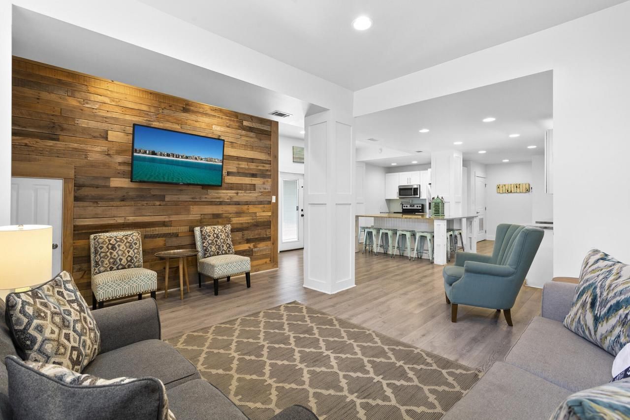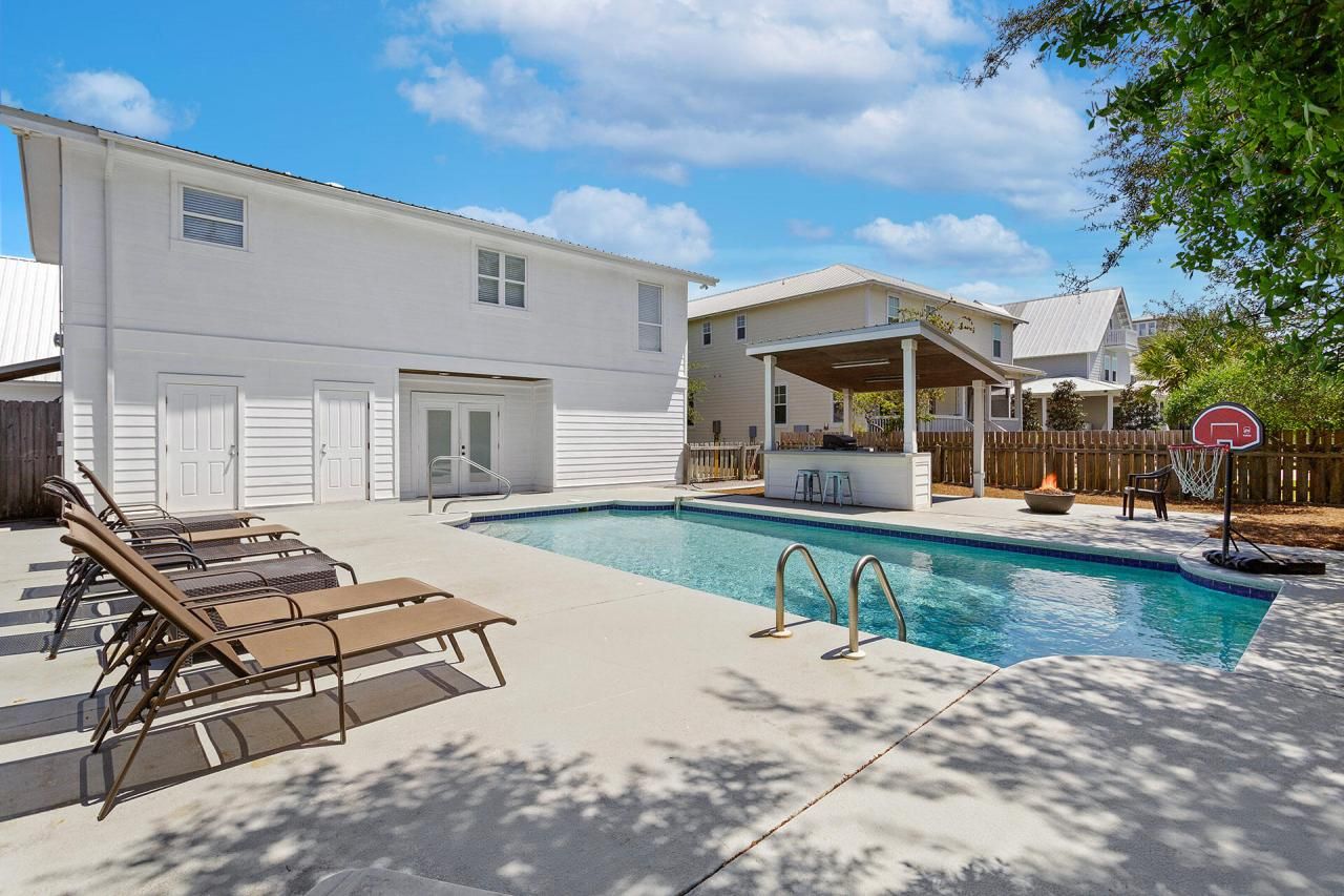 Welcome to On Point! This redesigned vacation rental compound is a must-see in the heart of Blue Mountain Beach. Situated on an expansive lot filled with oaks and tasteful landscaping, On Point offers an array of amenities. In addition to the main house and guest house accommodating up to 16 guests, there is an outdoor Tiki Cabana Bar with seating, a stainless steel gas grill, a Wet Bar, Enclosed shower, and a fire pit all surrounding your private heated swimming pool. Located just South of Scenic 30A, the neighborhood beach access down to the glittering Gulf is only minutes away on foot. Blue Mountain Beach has a claim to fame as the highest elevation found along the entire Gulf of Mexico. The sugary white beach here has been awarded a prestigious Blue Wave designation, the nation's highest natural beauty and cleanliness standard. A Health Food Spa is nearby, along with a few restaurants, a bakery, and an ice cream shop. This locale is in the heart of the beautiful world of Scenic 30A in South Walton. It is minutes away from many restaurants, beach bars, galleries, free concerts, and seasonal festivals in other picturesque coastal villages along this route. The architectural design of On Point seamlessly dovetails a rustic, cozy look with state-of-the-art modern amenities and creature comforts. Unique decorative art and vibrantly colorful seascapes adorn the walls throughout. There are full kitchens in both the main house and guest house, with separate living spaces for leisurely lounging. Gleaming stainless steel appliances and large granite-topped kitchen islands in each one comes with multiple stools for dining, drinking, and snacking. The main house has double glass doors that open onto the sparkling pool, literally steps away. Each of the five bedrooms is individually decorated in a charming cottage style for laid back living.Come and see for yourself. Book your showing at On Point and make your claim along the Emerald Coast!