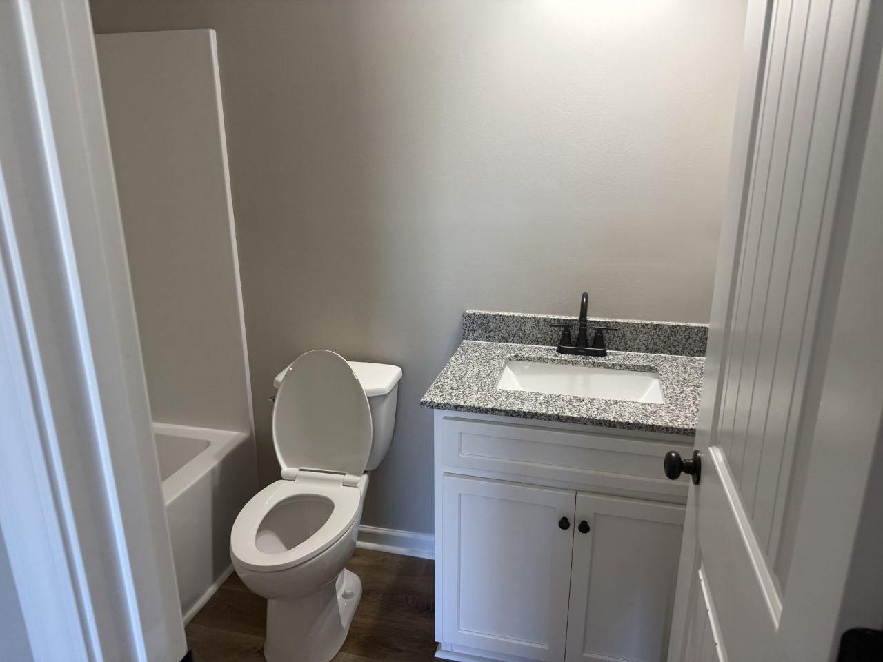 New construction featuring house with open floor plan, vinyl plank flooring throughout, stove, dishwasher, microwave, covered porch and rear deck.