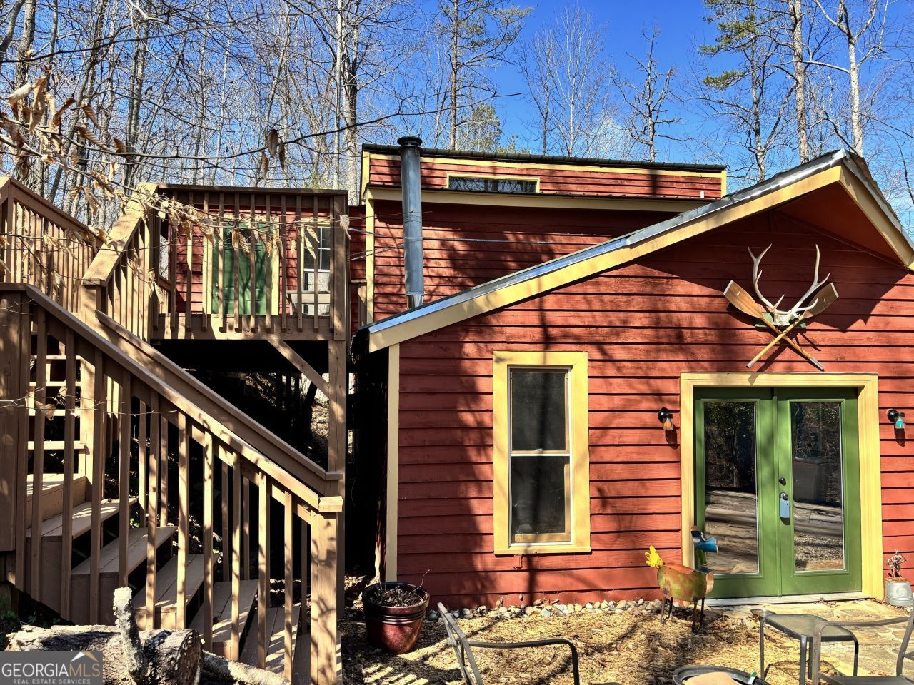Rustic and charming cabin near the Chestatee river, new hospital and new Publix grocery store. This property would be ideal for a two unit vacation rental on airbnb with both units offering separate entrances and private full bathrooms. Would also make an ideal getaway using the entire home. Featuring rough sawn cedar ceilings on both levels that add to the rustic cabin feel. First floor features large cedar ceiling living room with wood burning stove. Also find a private bedroom with rustic tin walls and a full bathroom. A full kitchen with dishwasher, electric stove. A large enclosed porch is also located on the first floor as well as a half bath. Second floor can be accessed by interior stairs from the first floor or by using outside stairs leading to a private deck for enjoying morning coffee with the birds. From the deck you enter a small living area that leads to a large bedroom with large closets, large bathroom and laundry area. Home could easily be remodeled to allow both upstairs and downstairs units access to the laundry room while maintaining privacy. The wooded lot provides privacy from neighboring homes. Carport also included and an outdoor two story building that can be used for storage or treehouse getaway. Property also includes legal access to the neighborhood shared property located nearby on the Chestatee river. Check out this charming rustic home today. It's priced to sell!