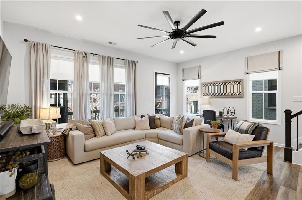Live at the center of it all in the highly sought-after Halcyon community AND enjoy a 10% off discount at Halcyon shops and restaurants as a resident. Live where dining, entertainment, and the Big Creek Greenway are just steps from your front door. Enjoy effortless walkability to top restaurants, bars, and fitness options, along with easy access for biking or morning strolls on the Greenway.This is the lifestyle buyers come to Halcyon for, offering convenience, energy, and accessibility without compromise. This beautiful end-unit townhome showcases high-end finishes throughout and features 3 bedrooms and 3.5 baths, with a bright, open-concept design ideal for both everyday living and entertaining.Inside, expansive windows fill the home with natural light, highlighting a thoughtfully designed layout that flows seamlessly from room to room. The chef's kitchen is a true focal point, featuring stainless steel appliances, an oversized island with leathered granite and prep sink, quartz countertops, a brick backsplash, and designer pendant lighting. The adjacent dining area feels both warm and elevated with a statement chandelier, while the spacious family room opens to a covered rear patio, creating an easy transition for indoor-outdoor living.Upstairs, the primary suite offers a refined and comfortable retreat with a tray ceiling, designer lighting, and a custom walk-in closet. The spa-inspired bath includes dual vanities, elegant tilework, and a seamless glass shower. A versatile third bedroom or flex space on the main level features a full bath and direct access to the patio, making it ideal for guests, a home office, or additional living space.Whether you are looking for a low-maintenance primary residence, a second home, or a lifestyle-driven move, this property offers exceptional value and flexibility in Halcyon. Opportunities that combine this level of location, space, and walkability are limited. Schedule your showing and experience it firsthand.